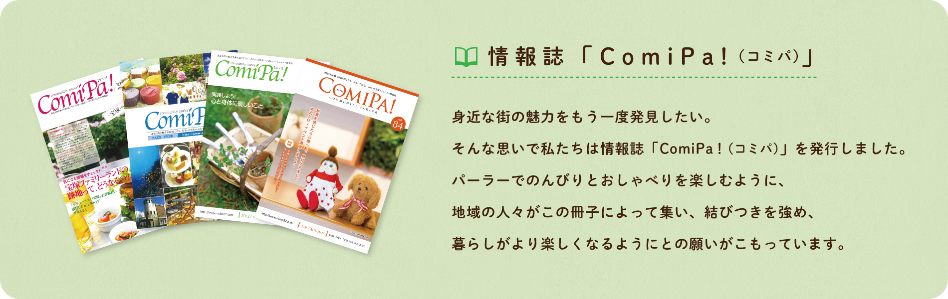 ニュース&お知らせ 2026年2月1日 お知らせ ホームページをリニューアルしました。 2025年12月15日 お知らせ 12/26~2026年1/4まで冬期休暇をいただきます。 2025年10月1日 お知らせ ComiPa!84号を発行いたしました。 2025年8月5日 お知らせ 8/7(木)~8/17(日)まで夏季休暇をいただきます。 2025年7月7日 お知らせ ComiPa!83号を発行いたしました。 事業内容 情報誌「ComiPa!(コミパ)」 情報誌「ComiPa!(コミパ)」が楽しい「パーラー」として、ホッとな話題や暮らしがより楽しくなるような、街の魅力をお届けします。 詳しくはこちら 住まいの情報誌 折り込みチラシでは伝えきれない、物件の街並みや歴史・すてきな店舗などを、丁寧な取材を通してご紹介します。 詳しくはこちら ブログ「宝塚コミパ通信」 宝塚市内を中心に、「今」の街の情報を毎日発信する「宝塚コミパ通信」は、月間約40万viewの親しまれるツールです。 ブログはこちら 印刷物の編集・制作 お客さまの想いがたくさんの方に伝わるような、チラシやパンフレット・ポスター・書籍などを制作いたします。 実績はこちら イベント、セミナー等の企画・立案 わくわくするイベントや、日々の暮らしに役立つセミナーを企画・開催し、人と街、人と人が繋がる場を作っています。 実績はこちら